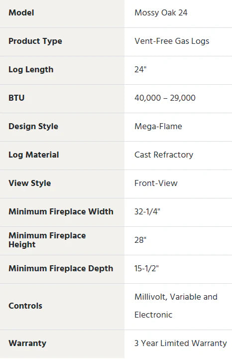 Superior Mossy Oak make a statement. The Mega Flame Series burner boasts a triple burner to achieve the look of a real wood fire! The burner is cantilevered to produce tall flames that will not be dwarfed by its massive 19" high logs, the tallest in the industry. The Mega Flame Series features two burners of bright yellow flames, plus a lower burner that creates a glowing ember bed. All models are heater rated with 99% heat efficiency and include a wood-burning grate appearance. 24" sets are designed for large 36" fireboxes. 30" sets are designed for larger 42" fireplaces. 36" sets are designed for a 48" and larger firebox.