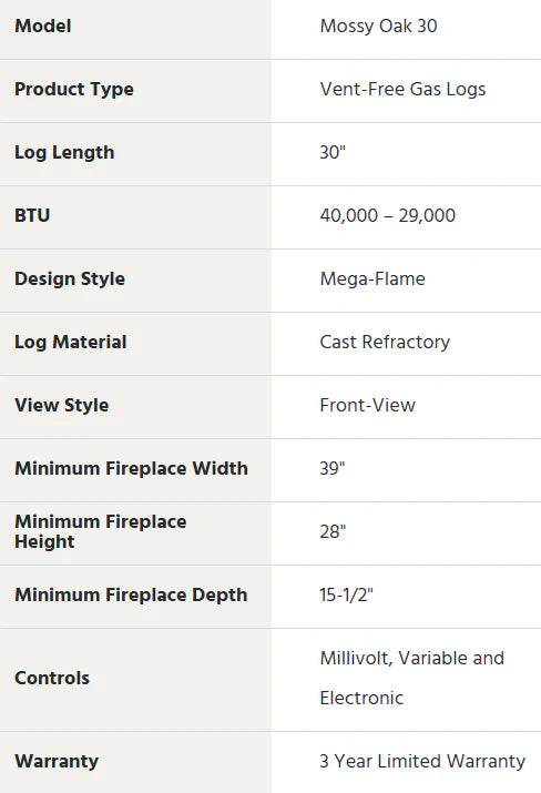 Superior Mossy Oak gas logs make a statement. The Mega Flame Series burner boasts a triple burner to achieve the look of a real wood fire! The burner is cantilevered to produce tall flames that will not be dwarfed by its massive 19" high logs, the tallest in the industry. The Mega Flame Series features two burners of bright yellow flames, plus a lower burner that creates a glowing ember bed. All models are heater rated with 99% heat efficiency and include a wood-burning grate appearance. 24" sets are designed for large 36" fireboxes. 30" sets are designed for larger 42" fireplaces. 36" sets are designed for a 48" and larger firebox.