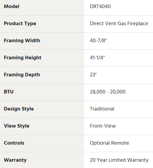 The DRT4000 Series of direct vent gas fireplaces represents affordable craftsmanship. This fireplace series comes standard with superbly designed high-definition logs, brilliant flames and glowing ember bed. The DRT4000 Series also offers a variety of optional accessories that will add more flair to your fireplace to make your home both warm and alluring.