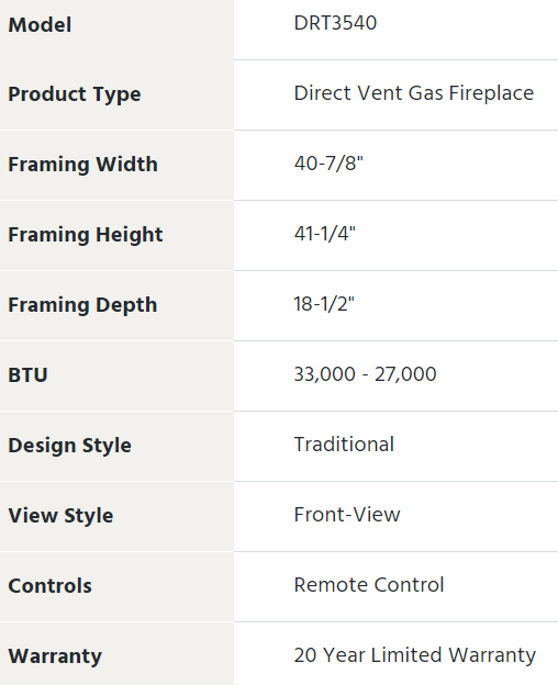 The DRT3500 Series of traditional direct vent gas fireplaces combines beauty, efficiency and performance. A wide selection of finish options include; Vista inside fit or multiple decorative outside fit facades (1-required included in price) and black reflective porcelain or a variety of ceramic fiber liners (1-required included in price). Standard features include: combination top/rear flue, electronic IPI/CPI ignition with seamless battery back-up, high definition ceramic fiber logs, interior lighting, ceramic glass, variable speed blower and full function remote. All required façade options are equipped with a standard protective screen barrier.