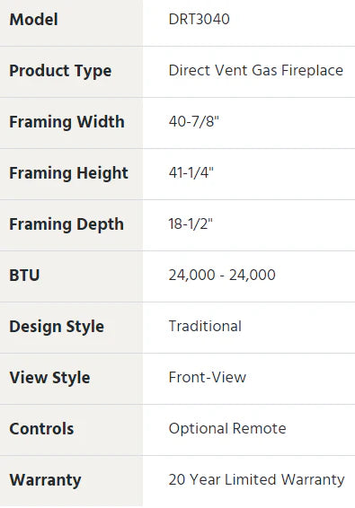 40" Superior Efficient Indoor Direct Vent Gas Log Fireplace DRT3000 Series DRT3040-E Modest yet refined, the DRT3000 Series fireplaces provide undeniable value and quality.