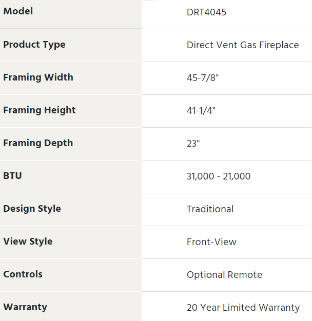 45" Direct Vent Custom Superior Full Size Deep Depth Complete Gas Log Fireplace DRT4045-C Series DRT4000 DRT4045 F4303 F4304