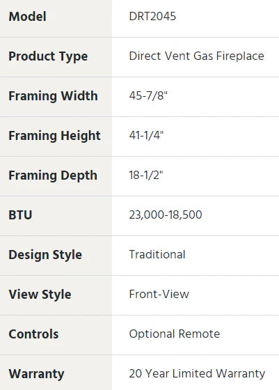 The DRT2000 Series offers excellent value without compromising on quality or design. These fireplaces offer an array of standard features, increased performance and state of the art technology to ensure many years of beauty and warmth. The DRT2000 Series of traditional direct vent gas fireplaces combine beauty, efficiency and value. Standard features include: combination top/rear flue, millivolt ignition or electronic IPI/CPI ignition with seamless battery back-up, detailed ceramic fiber logs, black painted interior, tempered glass, and Vista