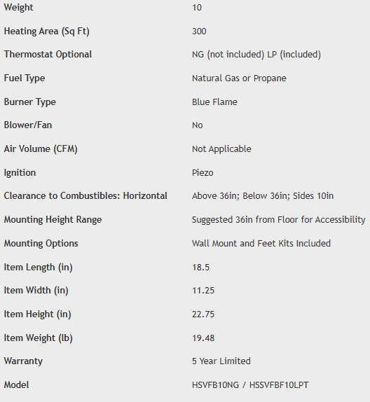 This Blue Flame 10,000 BTU vent-free heater is the perfect supplemental heating solution even on the coldest days. It is equipped with a multi-output valve for easy temperature regulation and a convenient Piezo ignition built right into the rotation of the knob for one-handed ignition. This unit can be permanently mounted to the wall or securely fastened to the floor with included mounting brackets and fasteners. A clean-burning blue-flame tube burner uses the natural convection of the burn to circulate warm, comfortable air. With a factory-standard Oxygen Depletion Sensor (ODS), rest assured this heater will provide you with years of comfortable and safe heat.