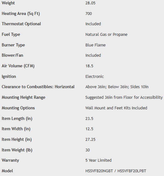 The Blue Flame 20,000 BTU heaters are the perfect supplemental heating solution even on the coldest days. This heater is conveniently equipped with a thermostat for superior control of the temperature in your space. Also, with a battery-powered electronic ignition, starting it is a breeze—battery included. This unit can be permanently mounted to the wall or securely fastened to the floor with included mounting brackets and fasteners. A clean-burning blue-flame tube burner uses the natural convection of the burn to circulate warm, comfortable air. With a factory-standard Oxygen Depletion Sensor (ODS), rest assured this heater will provide you with years of comfortable and safe heat.