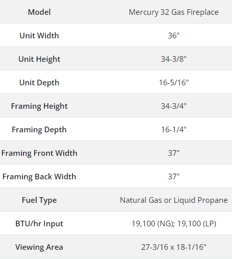 The Mercury gas fireplace adds comforting warmth, ambiance, and convenience to your space. A simple and easy hearth experience. It has a compact design with realistic logs and provides dependable warmth. Its 32" size makes it easy to install in those smaller rooms. This fireplace has the options of a blower fan, remote controls, mantels, shelves, and stone surrounds.