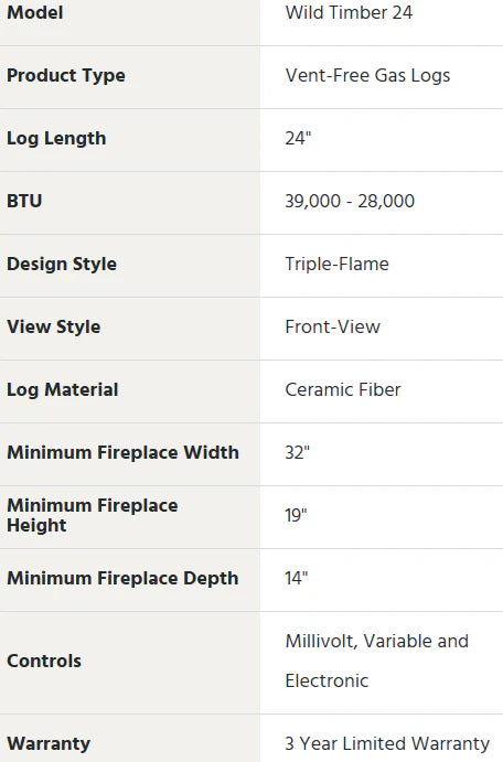 24" Concrete Wild Timber Vent Free Gas Logs and Triple Flame Burner