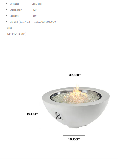 Each fire pit bowl has a unique appearance, with color variations and casual pitting that add to the organic nature of the concrete. Embrace the uniqueness and enjoy the cozy atmosphere that the 42" Cove Gas Fire Pit Bowl creates in your outdoor setting.