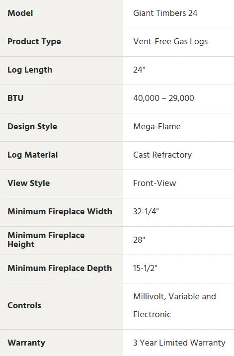 Superior Giant Timbers make a statement. The Mega Flame Series burner boasts a triple burner to achieve the look of a real wood fire! The burner is cantilevered to produce tall flames that will not be dwarfed by its massive 19" high logs, the tallest in the industry. The Mega Flame Series features two burners of bright yellow flames, plus a lower burner that creates a glowing ember bed. All models are heater rated with 99% heat efficiency and include a wood-burning grate appearance. 24" sets are designed for large 36" fireboxes. 30" sets are designed for larger 42" fireplaces. 36" sets are designed for a 48" and larger firebox.