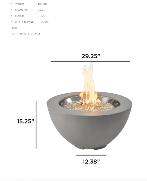 The Cove 29" Gas Fire Pit Bowl is the perfect addition to any contemporary outdoor space. The Natural Grey Supercast™ concrete lets the focus be on the stunning 20" Round Crystal Fire® Plus burner. The organic, nature of the concrete is unique to each fire pit. Color variations and casual pitting are common attributes to the fire pit.