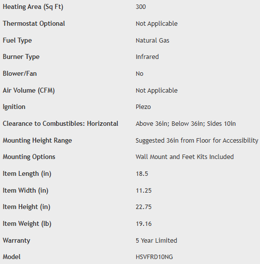 This Radiant 10,000 BTU Natural Gas or Propane Gas Vent Free heater is the perfect supplemental heating solution even on the coldest days. It is equipped with a multi-output valve for easy temperature regulation and a convenient Piezo ignition built right into the rotation of the knob for one-handed ignition. This unit can be permanently mounted to the wall or securely fastened to the floor with included mounting brackets and fasteners. Multiple burner tiles utilize radiant heat, warming your space with the power of the sun. With a factory-standard Oxygen Depletion Sensor (ODS), rest assured, this heater will provide you with years of comfortable and safe heat.