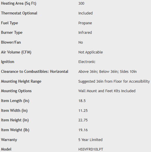 This Radiant 10,000 BTU Liquid Propane Vent Free heater is the perfect supplemental heating solution even on the coldest days. It is equipped with a multi-output valve for easy temperature regulation and a battery-powered electronic ignition built right into the rotation of the knob for one-handed ignition (battery included). This unit can be permanently mounted to the wall or securely fastened to the floor with included mounting brackets and fasteners. Multiple burner tiles utilize radiant heat, warming your space with the power of the sun. With a factory-standard Oxygen Depletion Sensor (ODS), rest assured this heater will provide you with years of comfortable and safe heat.