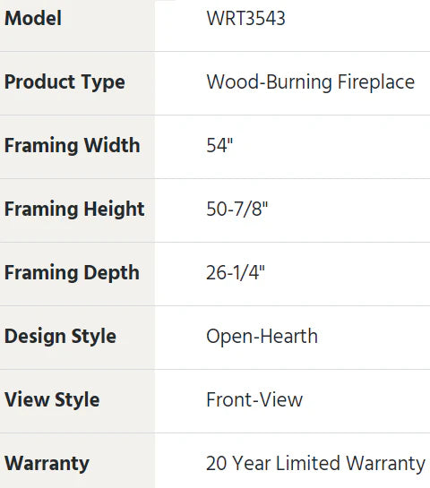Bringing the beauty and warmth of a wood-burning fireplace to any room in the home, the WRT3500 features an unobstructed view of the flame with beautiful refractory panels. Retractable mesh fire screens and optional bi-fold glass doors offer the perfect complement to any décor and look great with or without a fire.