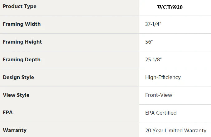 The WCT6920 high efficiency, EPA-certified wood burning fireplace has advanced combustion system technology and variable combustion air control delivers clean and powerful non-catalytic combustion heating. Combined with a traditional style arch front design and compact firebox the WCT6920 is ideal for smaller spaces and transforms any room into an inviting gathering space.